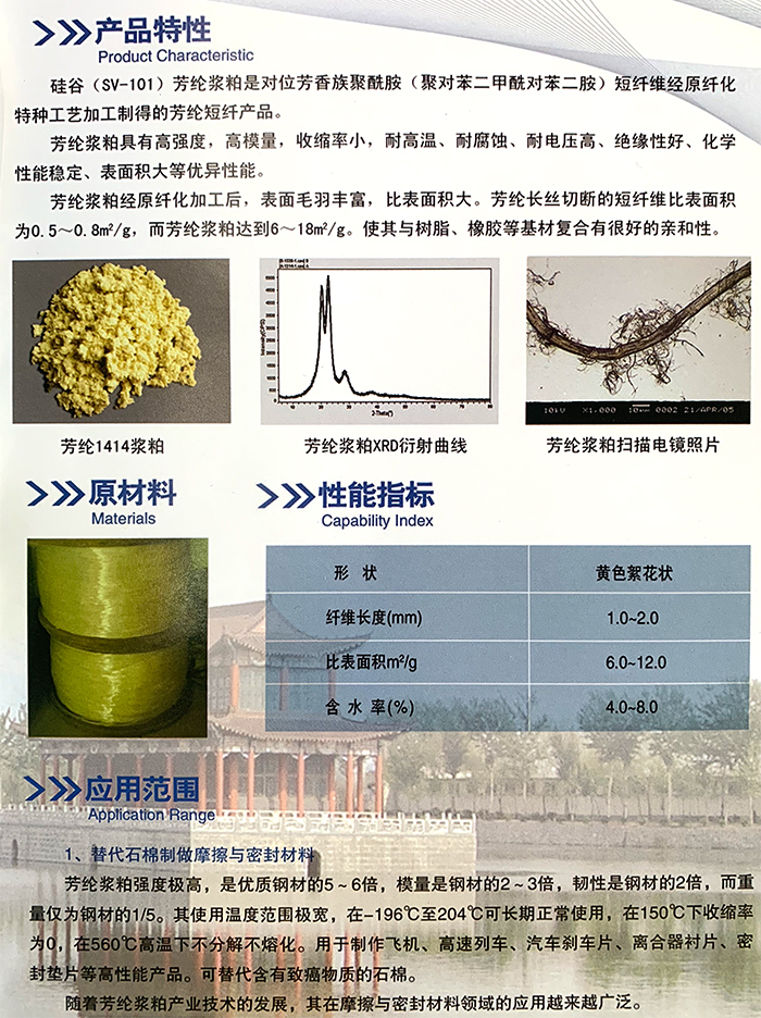SV-101 aramid pulp is a kind of aramid staple fiber product made from para aramid staple fiber (poly-p-phenylene terephthamide, PPTA, Fanglun 1414) by special process flow.